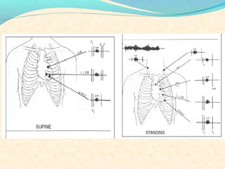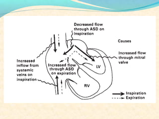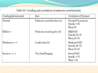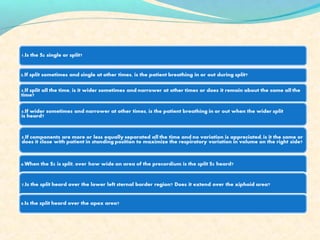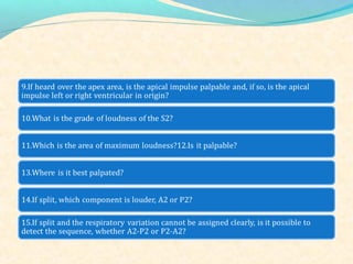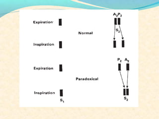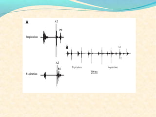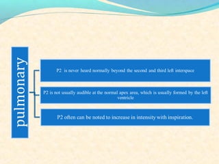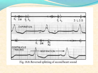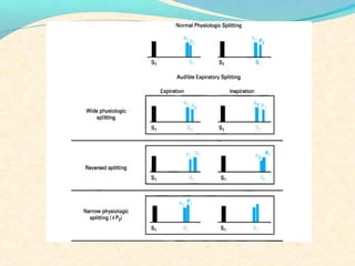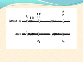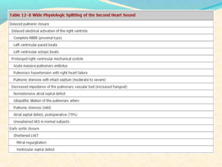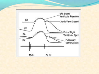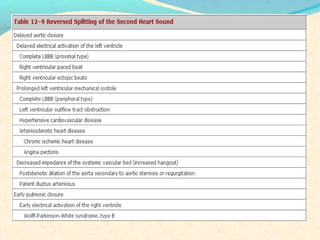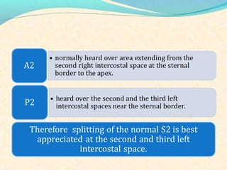 The second heart sound occurs at the end of systole due to closure of the semilunar valves. There are normally two components: A2 from aortic valve closure and P2 from pulmonary valve closure. A2 is typically louder due to higher pressures in the aorta. The components are normally split, with A2 occurring earlier due to differences in vascular resistance and compliance between the pulmonary and systemic circulations. Widening of the split may indicate conduction delays or pulmonary hypertension. Reversed or paradoxical splitting can occur in conditions that delay left ventricular ejection such as left bundle branch block. Single second heart sounds may result from fusion of the components or absence of one.