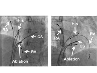 This document discusses the assessment of intracardiac shunts by cardiac catheterization. It describes how an oximetry run is performed to detect a left-to-right shunt by measuring oxygen saturation at various locations in the heart and great vessels. A significant step-up in oxygen saturation between the right atrium and ventricle or pulmonary artery suggests a left-to-right shunt. The document also discusses calculating shunt ratios using indicator dilution techniques and identifying shunt locations with angiography and pressure measurements. Complications of the procedure are outlined.