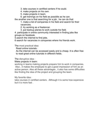 This document outlines ideas to help someone who is having trouble finding a job due to a lack of optimism and technical skills. It suggests improving personal skills like communication and self-confidence through activities like reading, socializing, and practicing interviews. It also recommends developing technical skills by taking online courses, reading tutorials, doing projects independently and in teams, and getting training and certifications. Additional job searching ideas include making lists of potential employers, freelancing, having backup career plans, using online communities, and asking employed friends about openings.