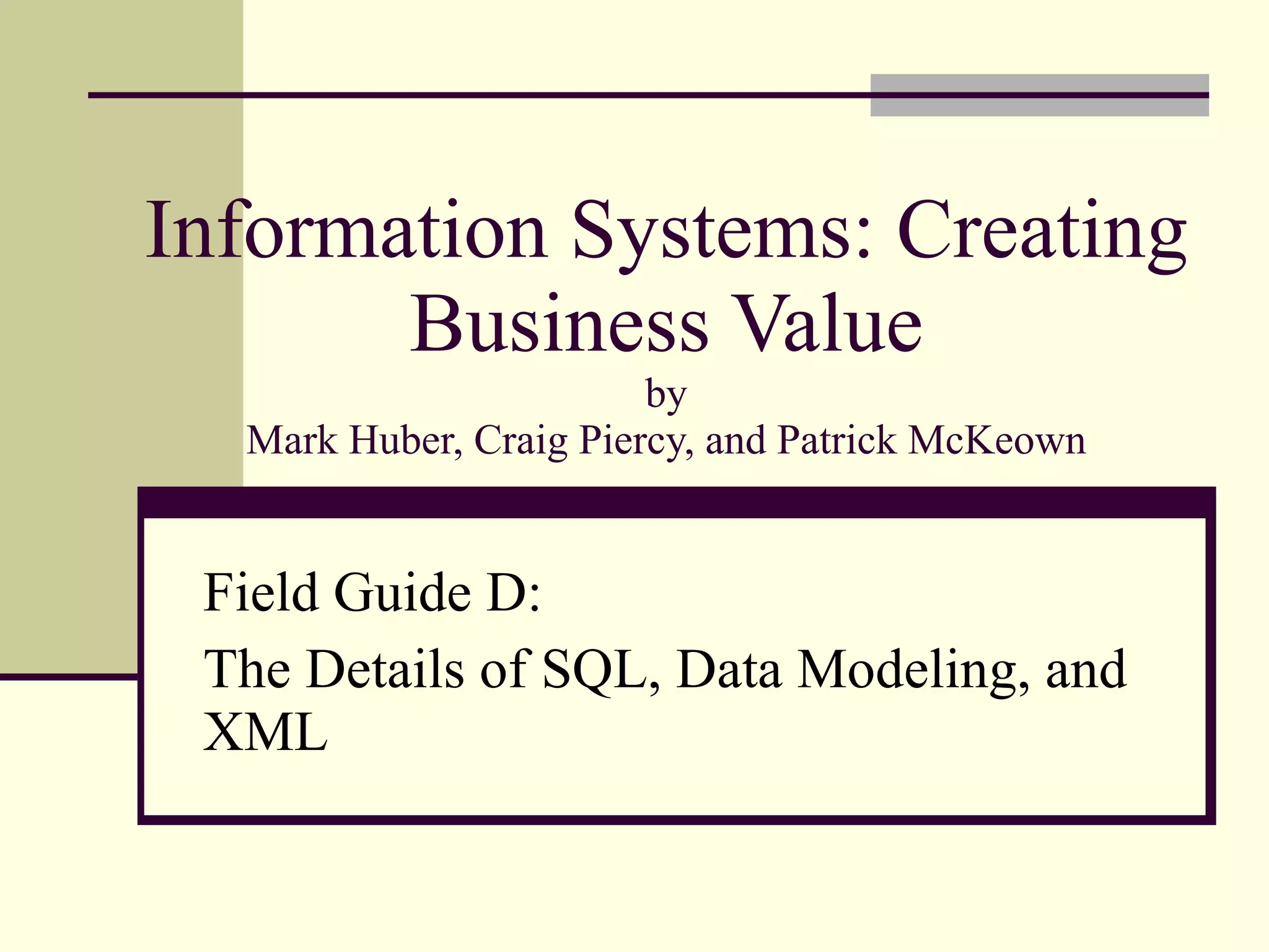 Specifically, it covers: using SQL to query single and multitable databases; logical modeling using entity-relationship diagrams; converting entity-relationship diagrams into relational data models; and performing JOIN operations to query relationships across multiple tables.