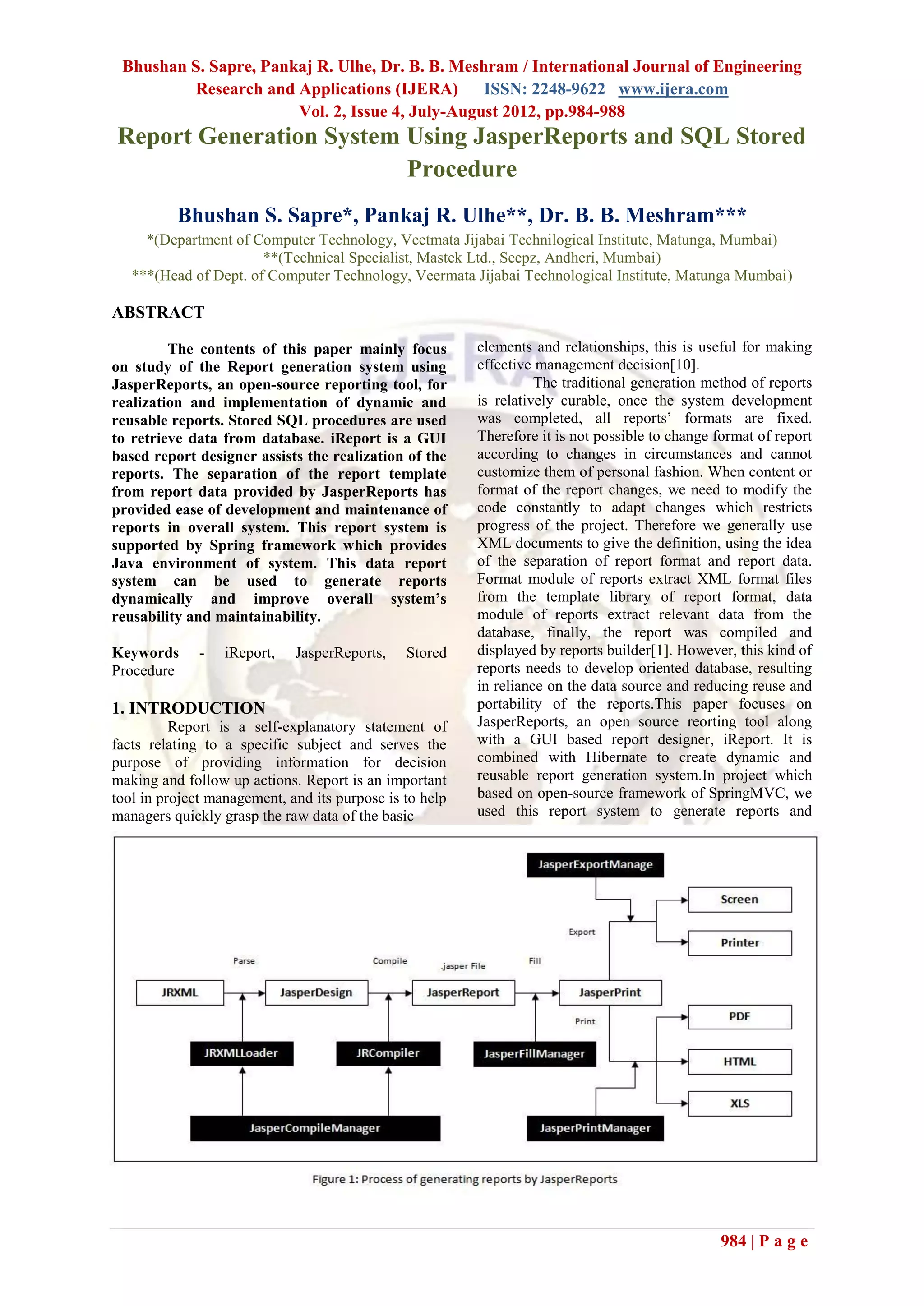 This document discusses a report generation system using JasperReports and SQL stored procedures. JasperReports is an open-source reporting tool that can generate dynamic and reusable reports. Stored procedures are used to retrieve data from the database. The separation of report templates from report data in JasperReports allows for easier development and maintenance of reports. This reporting system integrated with Spring framework provides a Java environment and can generate dynamic reports to improve system reusability and maintainability.