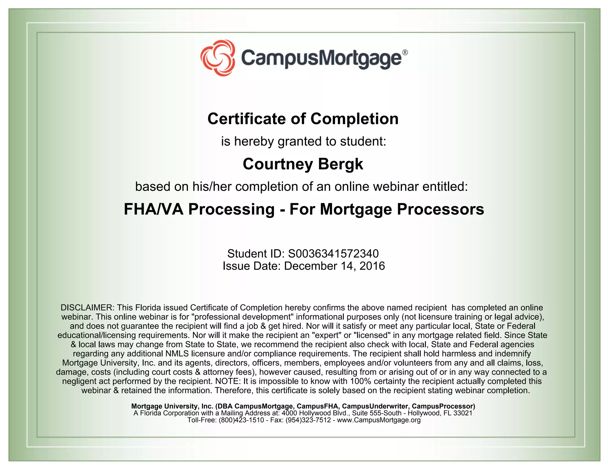 This certificate confirms that Courtney Bergk completed an online webinar on FHA/VA Processing for Mortgage Processors on December 14, 2016. The certificate serves to document professional development but does not guarantee a job or satisfy licensing requirements. It also notes that state laws may impose additional compliance requirements beyond the webinar's content.
