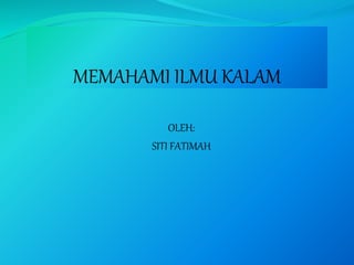 Dokumen ini membahas ilmu kalam, yaitu teologi Islam yang menggunakan logika dan filsafat untuk membahas isu-isu ketuhanan. Ruang lingkupnya mencakup keyakinan akan eksistensi Tuhan, keesaan-Nya, dan masalah-masalah yang bertentangan dengan akidah. Ilmu kalam berfungsi untuk memperkuat akidah Islam, menolak ajaran sesat, dan menarik orang baru untuk memahami Tuhan secara rasional.
