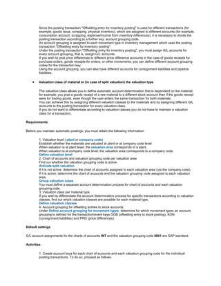 This document provides instructions for configuring automatic postings in an ERP system for inventory management and invoice verification transactions. Key steps include defining valuation levels, charts of accounts, valuation grouping codes, valuation classes, and account groupings. The system can then simulate postings to automatically determine the correct GL accounts based on these definitions and the transaction type. Definitions must be made for each chart of accounts and valuation grouping code combination.