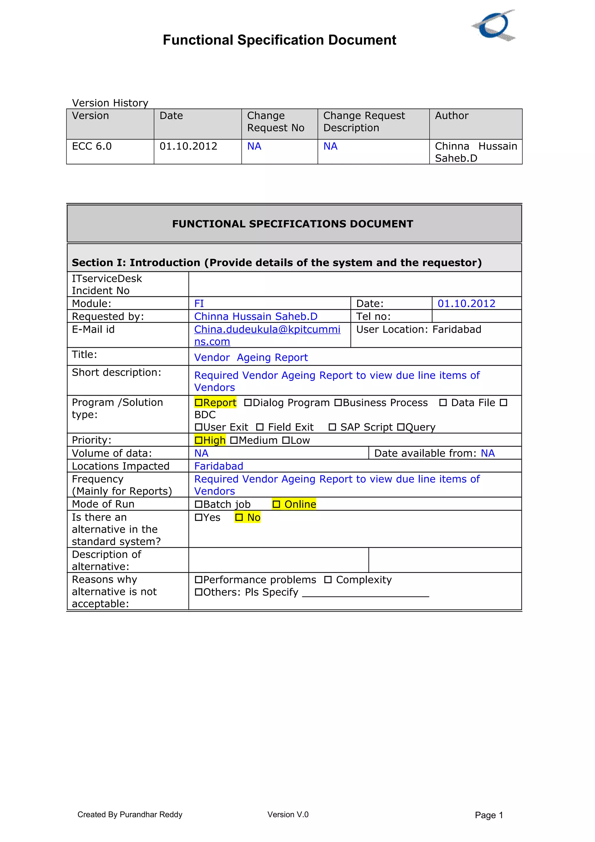 This document provides a functional specification for a vendor ageing report requested by Chinna Hussain Saheb.D. The report aims to display open payment items due from vendors according to ageing categories like 15, 30, 45, 60, 90, 180 and 360 days. It will retrieve required fields from SAP tables BSIK and FAGLFLEXA to show vendor account, company code, posting date, document number, amount, and other details for normal and special general ledger items by ageing period. The report output will be in an Excel file format for management review before processing vendor payments.