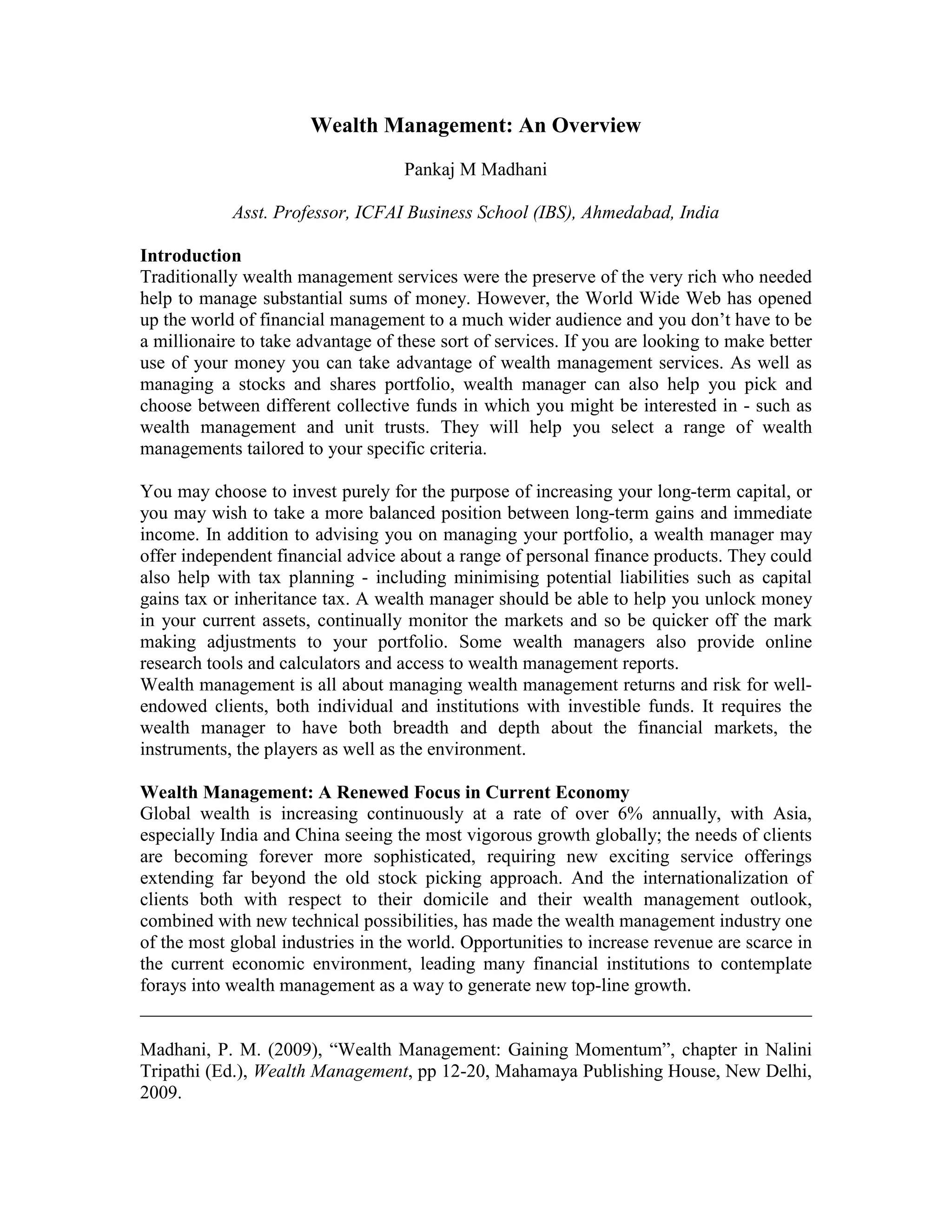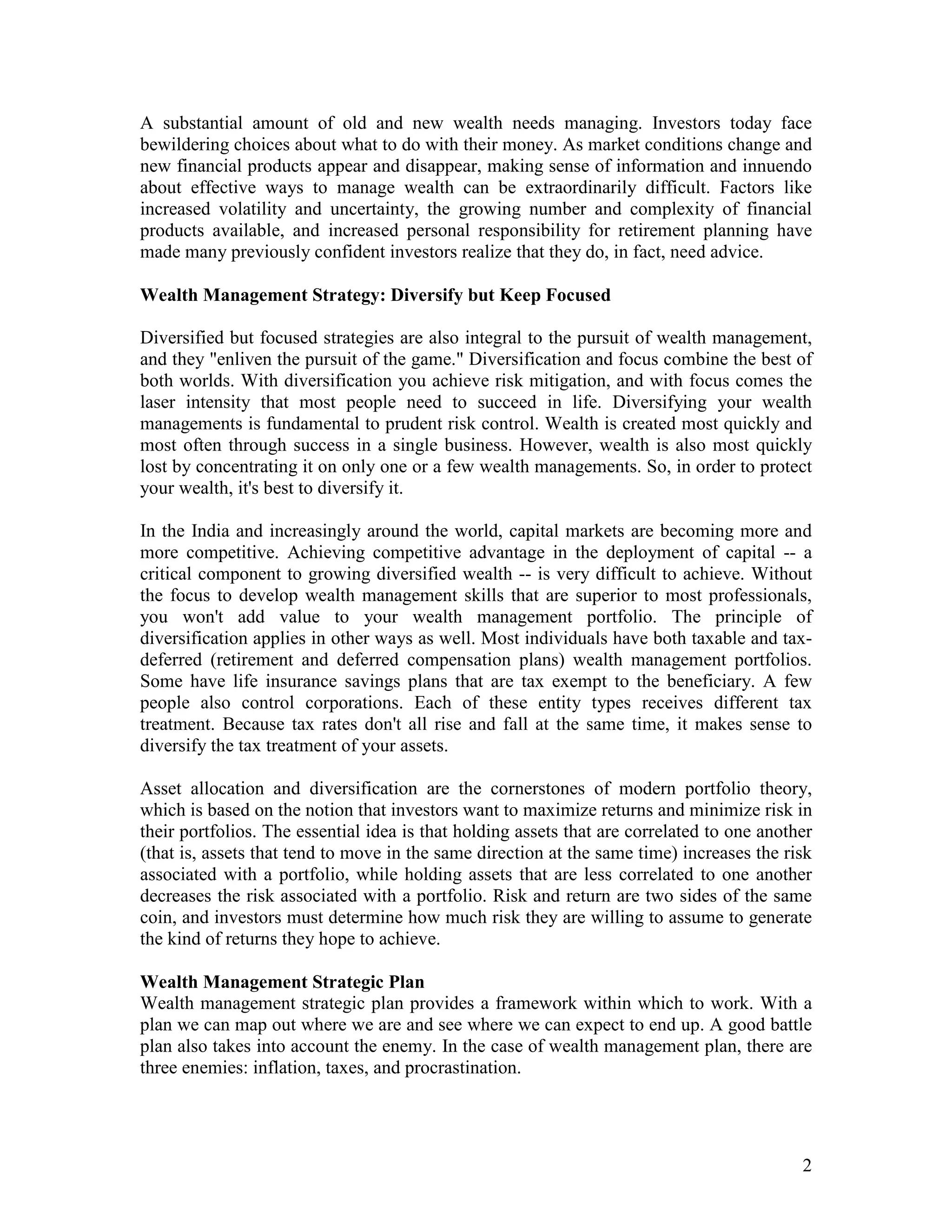 The document provides a comprehensive overview of wealth management, highlighting its evolution from a service for the wealthy to an accessible option for a broader audience. It emphasizes the importance of diversification, strategic planning, and personalized advice in managing wealth while navigating a complex financial landscape. The report also outlines the key characteristics and competencies necessary for successful wealth management, including relationship building, integrated information, and client-centered service.