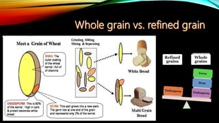 The document discusses the importance of dietary fiber, which is found exclusively in plant foods and helps regulate blood sugar levels while promoting digestive health. It provides recommendations for daily fiber intake, emphasizing a variety of vegetables, whole grains, fruits, and legumes, along with strategies for incorporating fiber-rich foods into meals. Increasing fiber intake should be gradual, complemented by adequate hydration, for optimal health benefits.