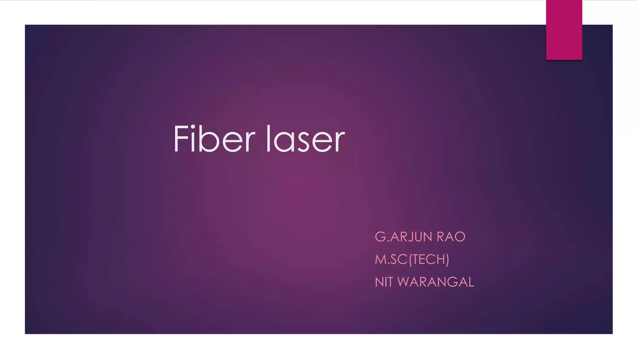 This document provides an overview of fiber lasers, including their basic components and advantages over conventional solid-state lasers. It discusses the history of fiber lasers beginning with Maiman's demonstration of the ruby laser in 1960 and Snitzer's development of the first fiber laser in 1961. The key components of a fiber laser are described, including the double-clad fiber structure, fiber Bragg gratings, and common dopant elements such as neodymium, ytterbium, and erbium that produce important emission wavelengths. Advantages of fiber lasers include high power capability due to efficient cooling, stability, reliability, lower cost, and insensitivity to environmental changes. Remaining challenges include designing new host and dopant