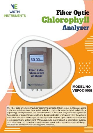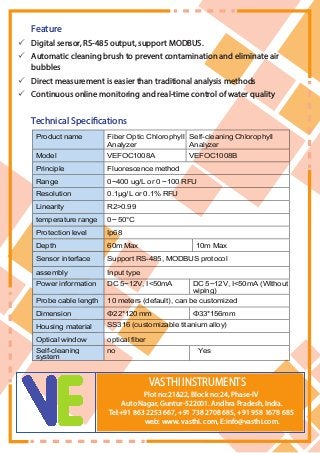 The Fiber-Optic Chlorophyll Analyzer adopts the principle of the fluorescence method. According to the spectral absorption characteristics of chlorophyll a, the water body is irradiated by a high-energy LED light source, and the chlorophyll a in the water body is excited to generate fluorescence of a specific wavelength, and the concentration of chlorophyll a in the water is measured. The sensor's fiber-optic structure provides excellent repeatability and stability and is less susceptible to ambient light. with automatic cleaning, and a brush to eliminate air bubbles, reduce the impact of contamination on the measurement, make the maintenance cycle longer, and maintain excellent stability for long-term online use.