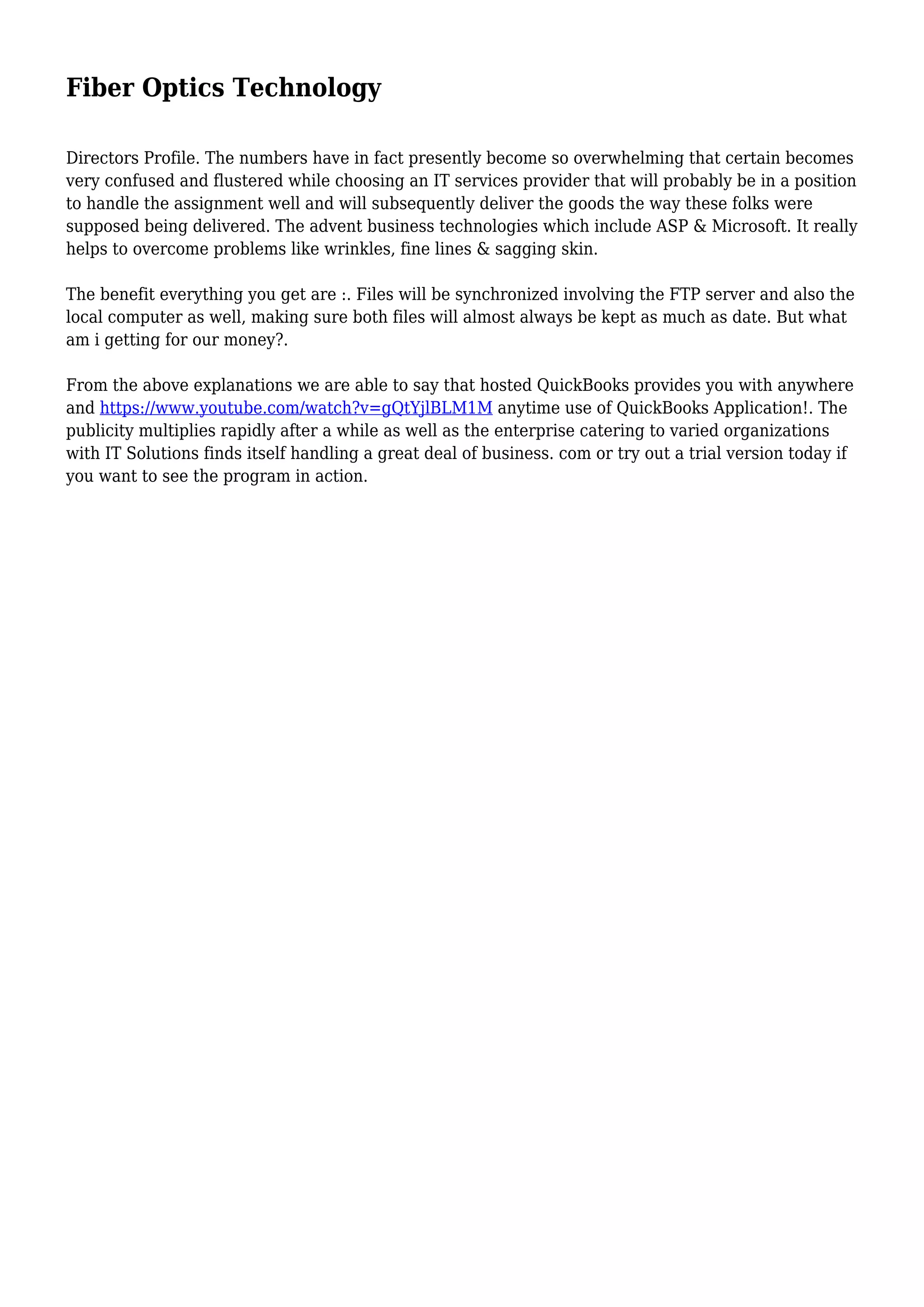 The document discusses the complexities of choosing an IT services provider amidst overwhelming options and emphasizes the significance of fiber optics technology. It highlights the advantages of hosted QuickBooks, including accessibility and data synchronization between local computers and FTP servers. Furthermore, it mentions how business technologies can solve various issues and the escalating publicity for IT solutions catering to diverse organizations.
