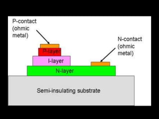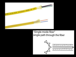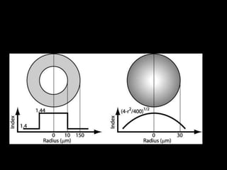Fiber optics use total internal reflection to transmit light through optical fibers. Fibers come in different materials and have either step index or graded index refractive index profiles. They can operate in single mode or multi-mode. Common light sources are LEDs and lasers, while detectors include photodiodes and PIN diodes. Loss mechanisms in fibers include attenuation, dispersion, and bending loss. Fibers are used in communication systems and sensors can measure temperature and displacement.