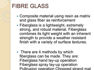 Fiberglass is a composite material made of glass fibers set in a resin matrix. It combines light weight with strength, providing a weather-resistant and robust material. There are four main methods to produce fiberglass: hand lay-up, spray lay-up, filament winding, and pultrusion. Fiberglass has applications in industries like telecommunications, construction, automotive, boats, and water/waste systems due to its properties of strength, corrosion resistance, and insulation.