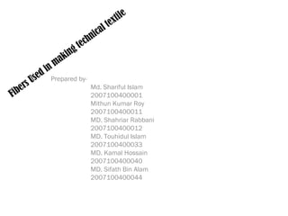 The document discusses fibers that are used to produce technical textiles based on their properties. It describes fibers like cotton, flax, jute, sisal, wool, silk, viscous rayon, polyamide, polyester, polypropylene, carbon fiber, polybenzimidazole, high modulus polyethelene, aramide, polyether ether ketone, and polyphenylene sulfide. It explains which technical textiles each fiber is suited for based on properties like strength, flame resistance, elasticity, and durability. The document concludes that textiles are developing and expanding into new high performance technology areas due to certain high performance fibers.