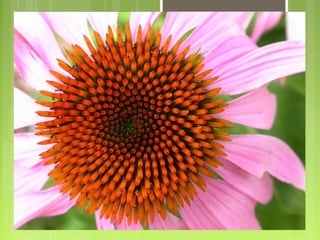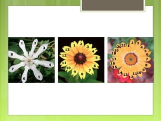 Fibonacci, originally named Leonardo de Pisa, was an Italian mathematician known for his famous rabbit problem which led to the creation of the Fibonacci sequence. This sequence, formed by adding the two previous numbers together, appears throughout nature, though not every plant exhibits Fibonacci numbers. The document also explores various natural patterns like symmetry, spirals, fractals, and tessellations, encouraging fifth graders to become 'pattern hunters' to observe and sketch these patterns.
