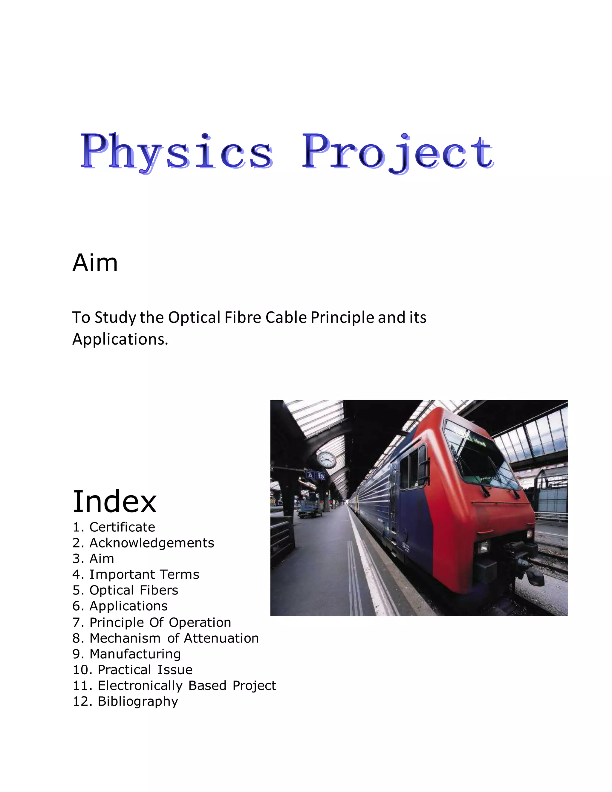 The document discusses the principles and applications of optical fiber cables. It begins with an introduction and table of contents. It then discusses the key components of optical fibers, including the core, cladding, and total internal reflection. It describes how these components enable optical fibers to transmit light signals over long distances with little attenuation. Finally, it outlines several applications of optical fibers, such as telecommunications, sensing, illumination, imaging, and lasers.