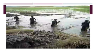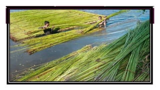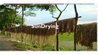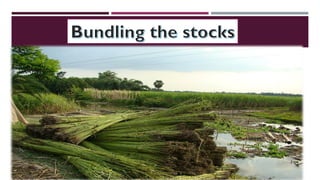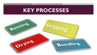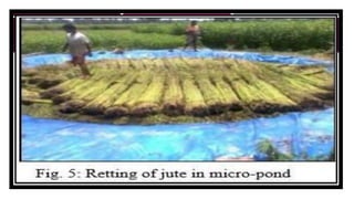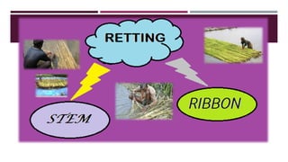 The document discusses fiber extraction processes, highlighting materials like cotton, flax, and jute used for various applications including textiles and cordage. It details the retting process, conditions for effective extraction, and methods for stripping fibers from plants, as well as the processing of sugarcane bagasse into fibers. Additionally, it outlines the recycling uses of these fibers in manufacturing and composites.