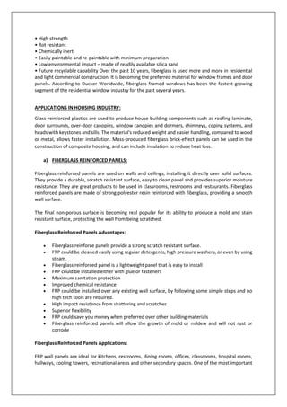 Fiberglass is a strong yet lightweight material made of glass fibers bound together with a plastic resin. It can be used to make various building products like roofing, doors, windows, insulation, and panels. Fiberglass products provide benefits like strength, corrosion resistance, insulation, and design flexibility at a lower cost than some other materials. They require relatively little maintenance over their long lifespan.