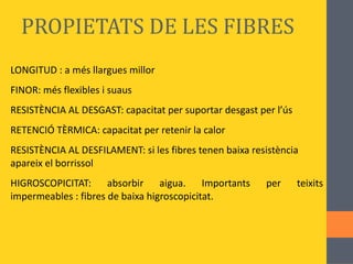 ORIGEN PROCEDÈNCIA NOMPROPIETATS USOS VEGETAL FRUIT COTÓ Suau i absorbeix bé la humitat. Fàcil de tenyir S’allarga i arruga fàcilment Teixits personals i domèstic Hidrofilat en medicina TIGES LLÍ Semblant al cotó Llenceria, roba d’estiu JUTE Poc flexible, resistent, brillant,basta i gruixuda. S’altera amb la humitat Soles d’espardenyes, catifes CÀNEM Igual que el jute roba FULLES ESPART Igual que el jute Soles d’espardenyes