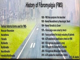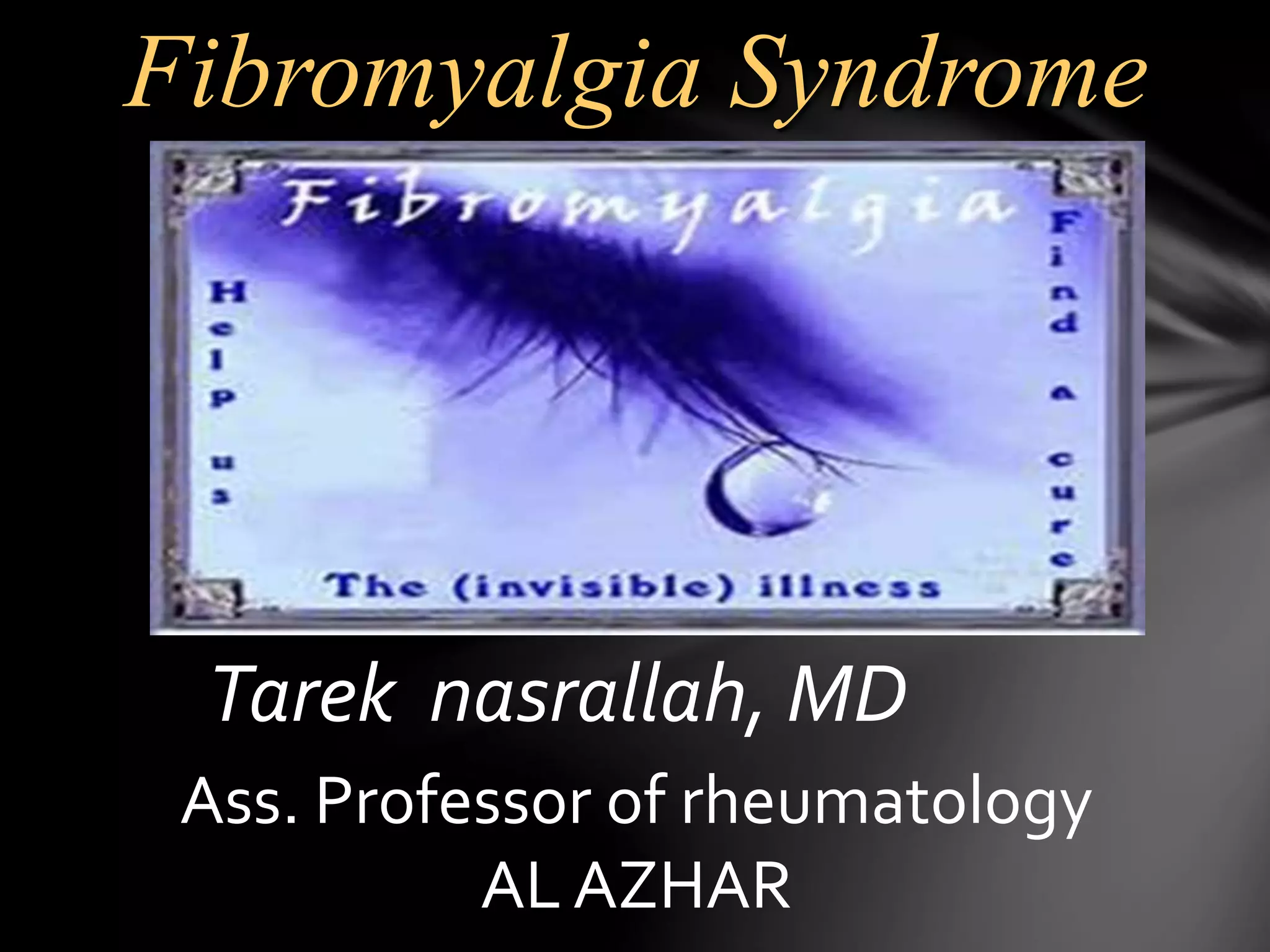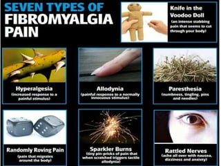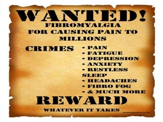 The document discusses fibromyalgia syndrome, emphasizing the challenges of diagnosing and treating the condition. It covers the pathophysiology, potential causes, and treatment strategies, including medications and lifestyle modifications. Additionally, it highlights the importance of comprehensive assessments to identify comorbidities and tailor treatment plans for effective pain management.