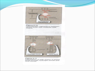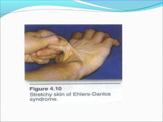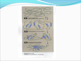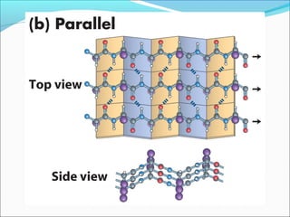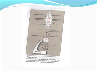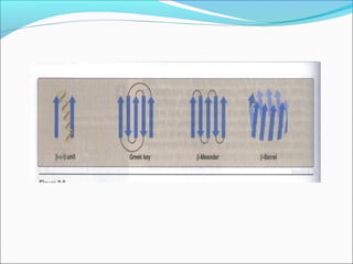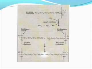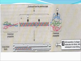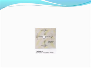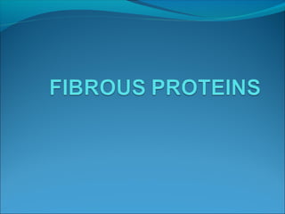 Collagen and elastin are fibrous proteins that provide structure in the body. Collagen forms a rigid triple helix structure made of three polypeptide chains. It is abundant in skin, bone, and cartilage. Elastin provides elasticity and is found in lungs, arteries, and ligaments. Both proteins derive their mechanical properties from their unique secondary and tertiary structures, which are stabilized by interactions between amino acid side chains.