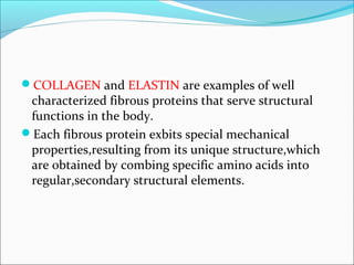Collagen and elastin are fibrous proteins that provide structure in the body. Collagen forms a rigid triple helix structure made of three polypeptide chains. It is abundant in skin, bone, and cartilage. Elastin provides elasticity and is found in lungs, arteries, and ligaments. Both proteins derive their mechanical properties from their unique secondary and tertiary structures, which are stabilized by interactions between amino acid side chains.
