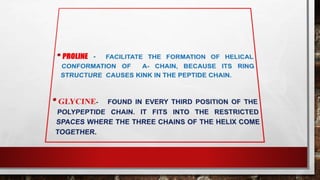 3) Collagen has a characteristic amino acid sequence of glycine-X-Y where X is often proline and Y can be hydroxyproline or hydroxy