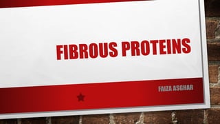 1) Fibrous proteins are usually insoluble and found in skin, connective tissue, blood vessels and other structures. They have high alpha-helix or beta-sheet content and examples include collagen, elastin, keratin and fibroin.