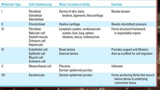 2) Collagen is the most abundant fibrous protein, making up 25-35% of the body's protein. It provides structure and strength, and there are at least 19 types designated by Roman numerals.