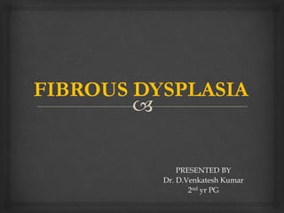 This document provides an overview of fibro-osseous lesions and focuses on fibrous dysplasia. It discusses the classification, etiology, clinical features, radiographic features, histologic features, treatment and prognosis of fibrous dysplasia. Fibrous dysplasia is a benign bone lesion caused by a mutation in the GNAS1 gene. It can present as monostotic, polyostotic or craniofacial lesions. Radiographically, it appears as radiolucent or radiopaque areas with a "ground glass" appearance. Histologically, it is characterized by fibrous tissue and irregular woven bone trabeculae. Treatment involves surgery or bisphosphonates and the prognosis is generally good