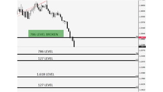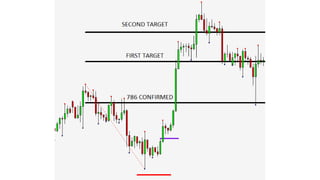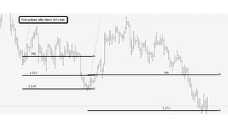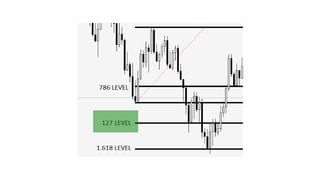 The document discusses using Fibonacci ratios to determine exit points when trading. Specifically, it recommends using the .786, 1.272, and 1.618 Fibonacci ratios projected from swings into a trade setup to determine profit taking levels. The .786 ratio acts as a confirming level, where if the ratio is broken in the direction of the trade, the 1.272 ratio comes into play for partial profit taking. If still in the trade, the 1.618 ratio can be a final extended target. Examples are provided of trades in EURUSD where price action corresponds well to taking profits at these Fibonacci ratio levels. Consistency is achieved by keeping exits objective and data-driven using this method.