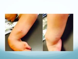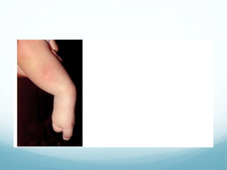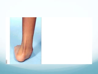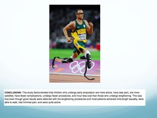 Fibular deficiency, or fibular hemimelia, is a rare congenital disorder where there is partial or complete absence of the fibula bone. It can cause a range of abnormalities in the leg including limb length discrepancy, foot and ankle deformities, and knee deformities. Treatment depends on the severity of deformities and expected limb length discrepancy. For severe cases with over 25cm expected discrepancy or non-functional foot, amputation is recommended. Mild cases with functional foot may be treated with foot reconstruction and limb lengthening procedures. The goals are to manage limb length, correct bone angles, and achieve a plantigrade, painless foot.