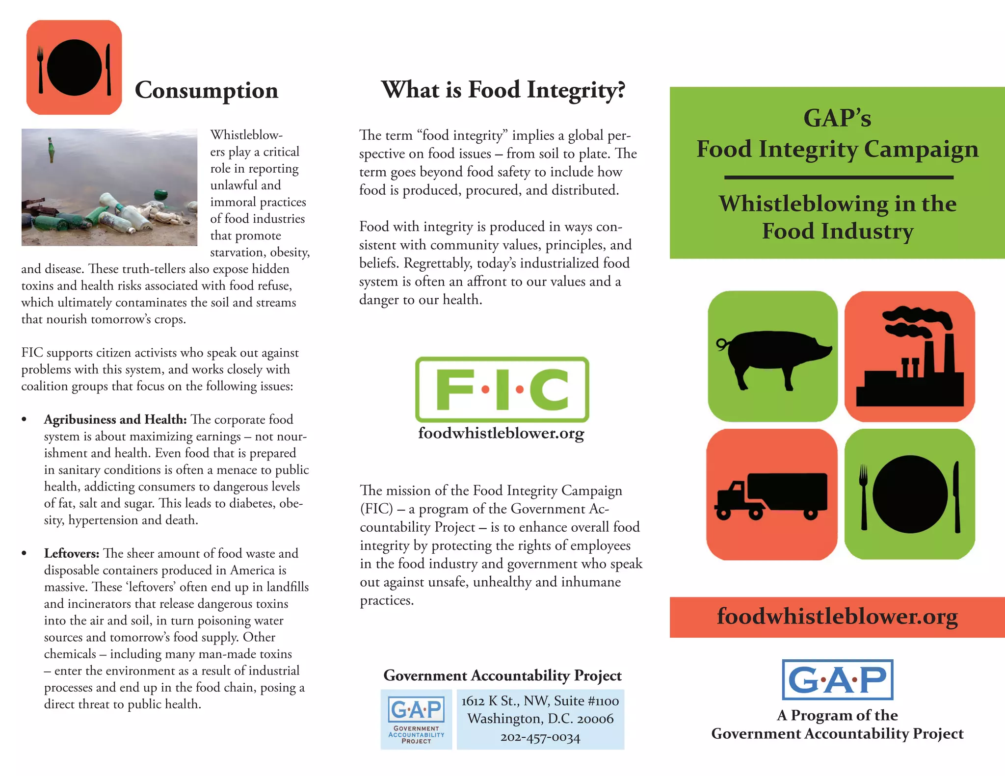 The document discusses food integrity and the role of whistleblowers in exposing problems in the food system. It defines food integrity as considering food issues from soil to plate, beyond just safety. Whistleblowers help report unlawful and immoral practices that promote health issues. The Food Integrity Campaign (FIC) supports whistleblowers and works on issues like agribusiness practices that prioritize profits over health, food waste, and exposing problems at various stages of food production, processing, transportation, and retail.
