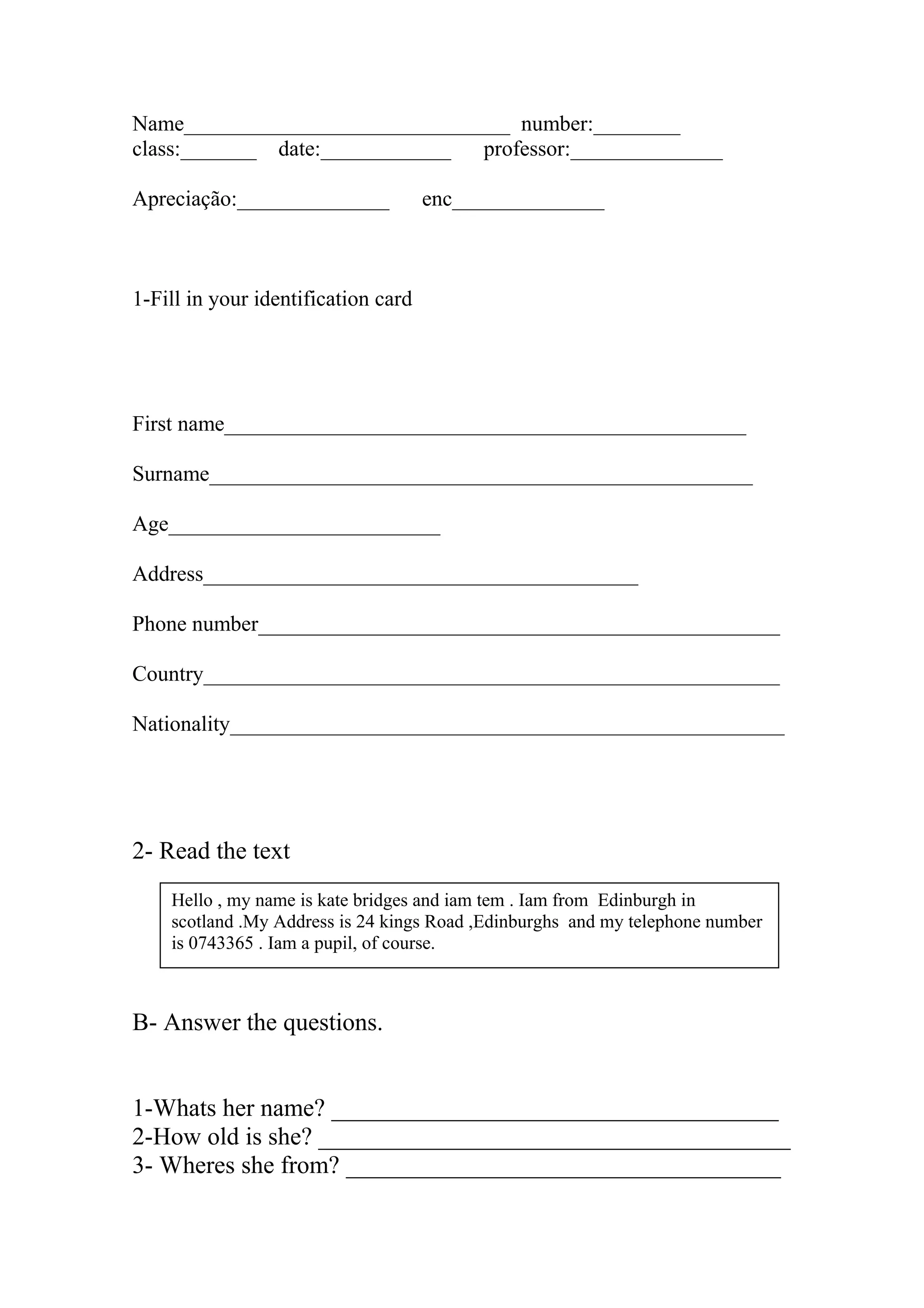 The document contains exercises testing reading comprehension, grammar, and filling in personal details. It appears aimed at students practicing and demonstrating their understanding of topics like personal identification, reading short texts for comprehension, using personal pronouns, and matching countries
