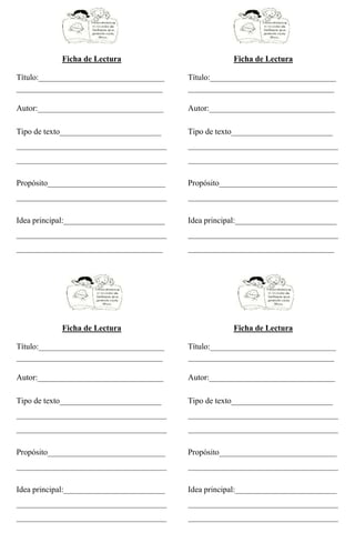 This document contains four blank reading summaries or "fichas de lectura" that can be used to record the title, author, type of text, purpose, and main idea for four separate readings. Each summary form has fields to note these key details about the reading in both Spanish and English. The overall document provides a template for systematically capturing and organizing essential information from multiple texts.