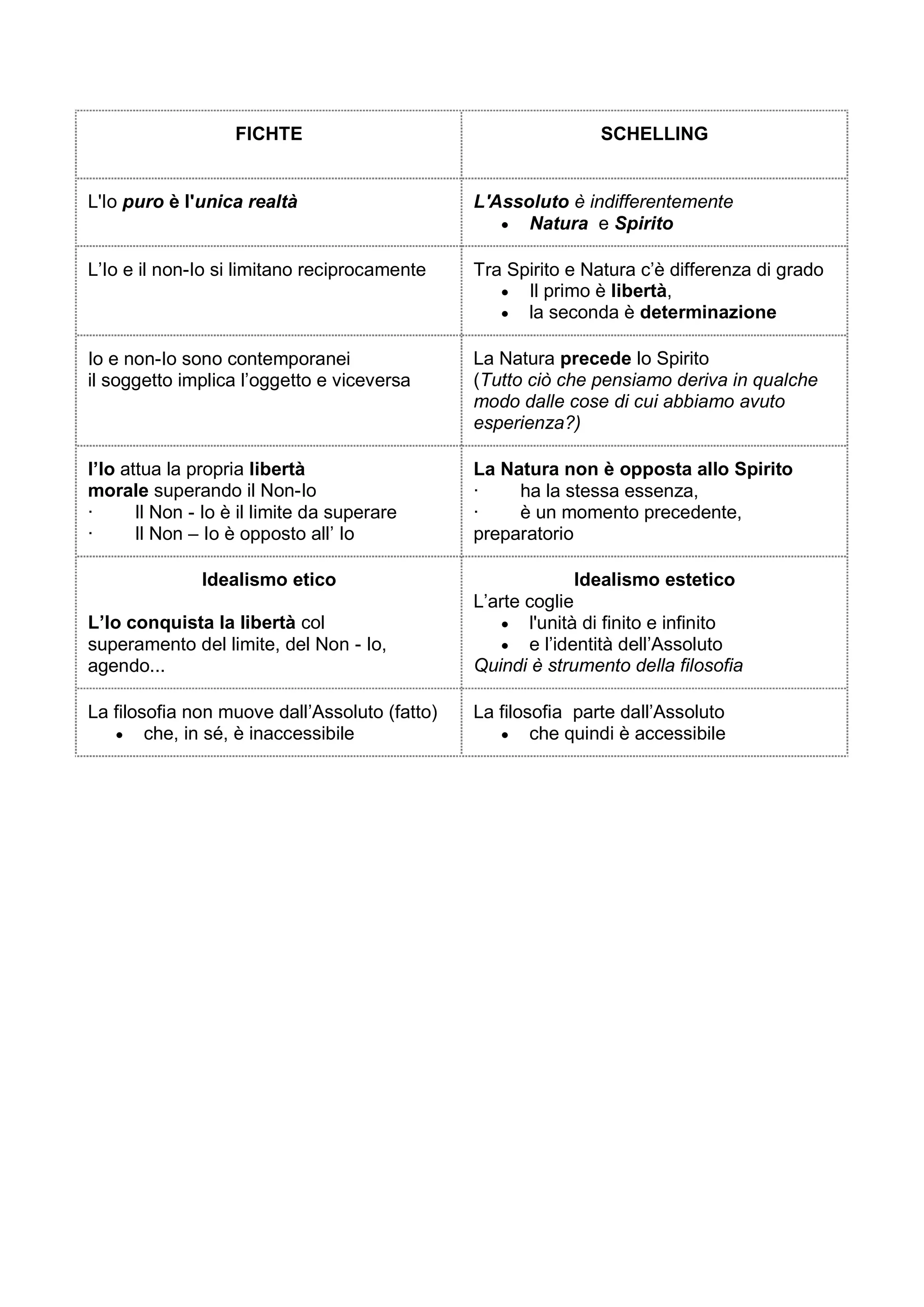 Il documento esplora le idee di Fichte e Schelling, secondo cui l'io puro è l'unica realtà e l'assoluto incorpora sia natura che spirito. Si evidenzia l'interdipendenza tra io e non-io, con la natura che precede lo spirito e l'importanza dell'arte e della filosofia nel raggiungere la libertà attraverso il superamento del non-io. La filosofia, pur partendo dall'assoluto, deve affrontare la sua inaccessibilità per giungere alla comprensione.