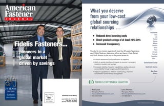 Fidelis Fasteners is a new company that is redefining the global fastener supply chain model. By working directly with manufacturers in China and India through local engineering teams, Fidelis can offer significant cost savings to customers of 30% or more. As global suppliers face pressure to lower costs, Fidelis' model provides transparency and trusted relationships between suppliers and customers. Fidelis partners have seen firsthand the challenges companies face and are helping position overseas suppliers and North American distributors to gain competitive advantages through their unique sourcing approach.