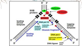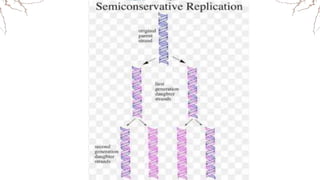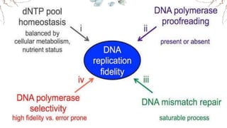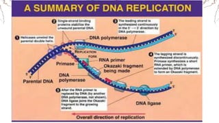 DNA replication involves the synthesis of new DNA strands through a semi-conservative process whereby each new molecule contains one old strand and one new strand synthesized using the old strand as a template. Key enzymes involved include helicase, which unwinds the DNA double helix, primase, which initiates DNA synthesis, and DNA polymerase, which catalyzes phosphodiester bond formation to elongate the new strands. Fidelity is maintained through proofreading mechanisms that remove incorrectly incorporated nucleotides and DNA repair pathways that correct errors made during replication.