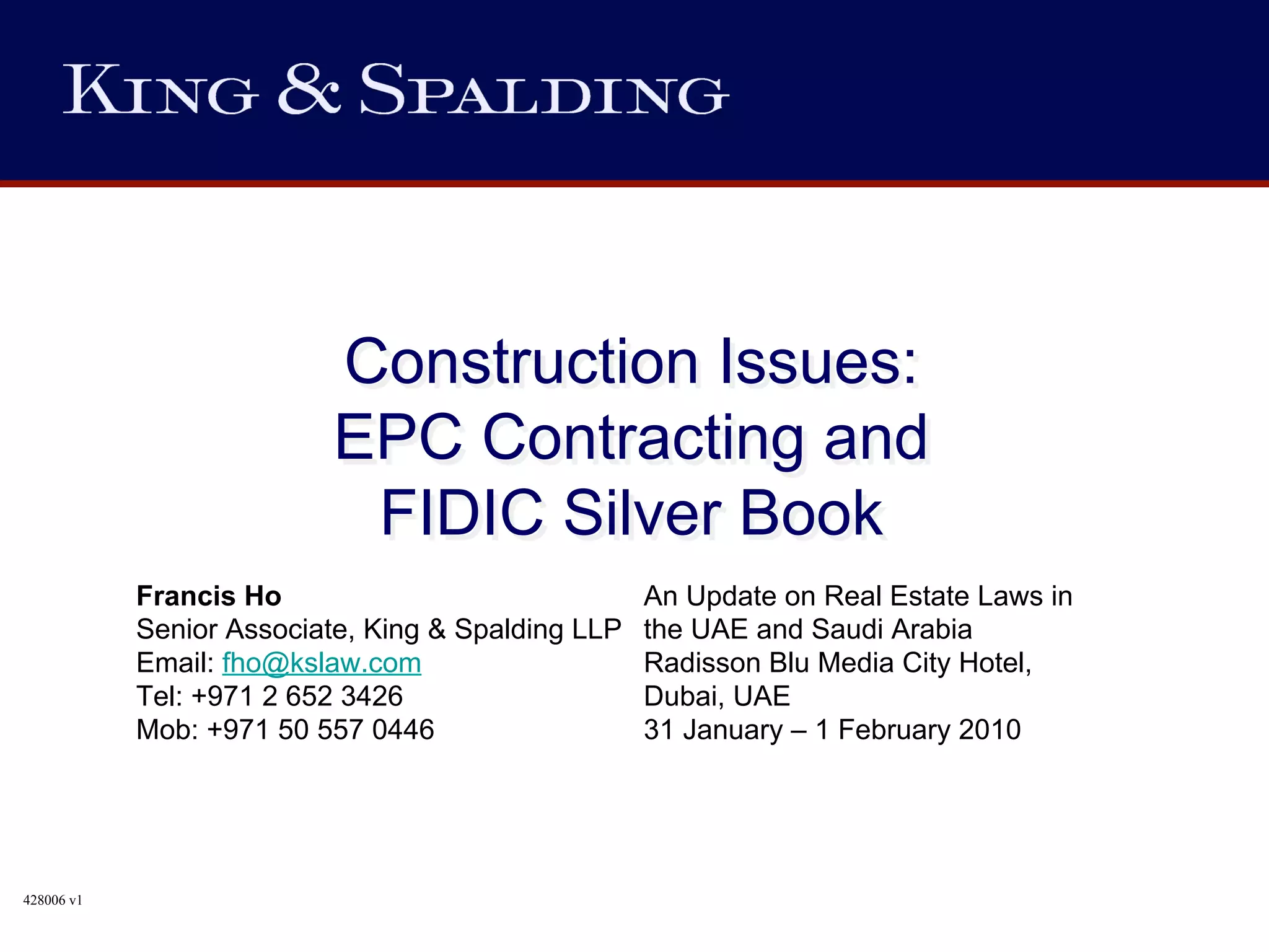 The document discusses key aspects of EPC contracts and the FIDIC Silver Book for major infrastructure projects. It notes that EPC contracts allocate significant risk to contractors in exchange for price and schedule guarantees. The FIDIC Silver Book is a turnkey contract form that departs from the usual risk allocation. The summary highlights common bankability issues for lenders and key contract clauses around fixed price and schedule, performance guarantees, liability caps, security provisions, and defects liability.