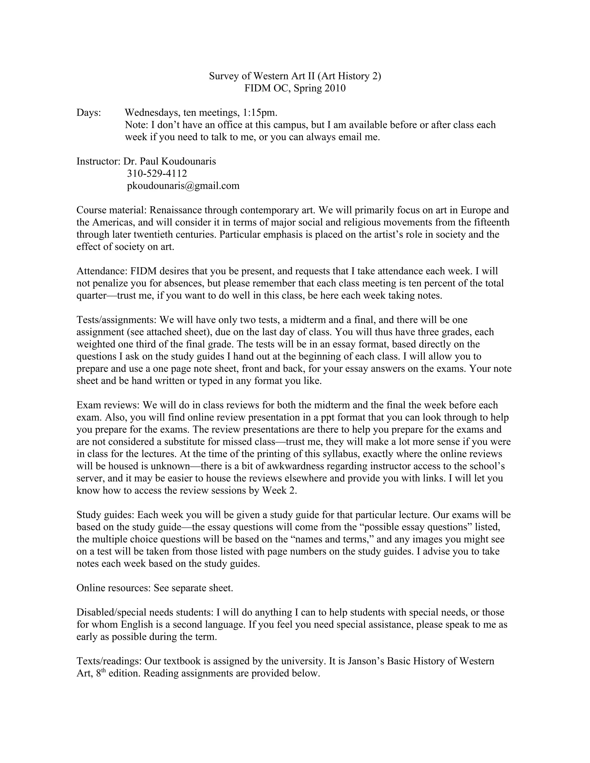This document provides information about an Art History II course being offered at FIDM OC in the spring of 2010. It will cover Renaissance through contemporary art in Europe and the Americas, with an emphasis on the artist's role in society. The class meets on Wednesdays and attendance is encouraged but not penalized. There will be two tests - a midterm and final - and one assignment, each weighted equally for the final grade. Study guides will be provided each week to prepare for exams. Students have two options for the final assignment - analyzing a work of art at a local museum or devising their own approved project related to the course material.