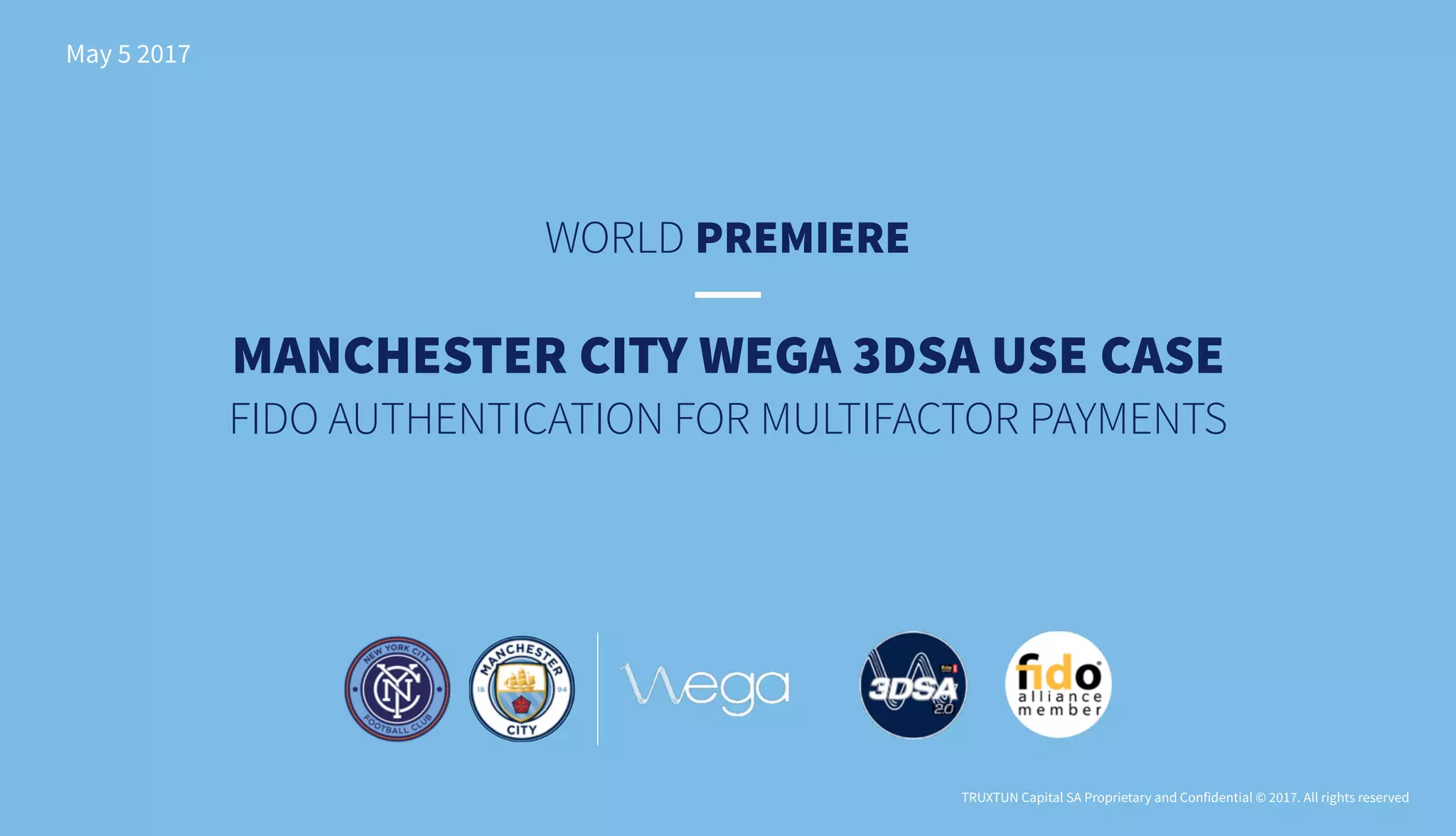 The document details the launch of Manchester City's WEGA 3DSA 2.0 payment suite, featuring FIDO authentication for secure multifactor payments and fan engagement solutions. It provides a comprehensive platform for in-stadium services, including mobile payments, digital ticketing, and charitable donations, all integrated via a mobile app and enhanced by wearable technology. Objectives include creating a seamless fan experience while generating revenue through enhanced loyalty programs and direct engagement with fans.
