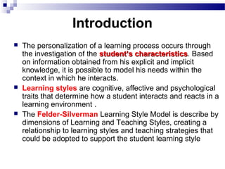 The document discusses the personalization of learning processes through the classification of student preferences and learning styles based on the Felder-Silverman model. It presents a proposed system architecture for identifying student learning profiles using monitoring mechanisms that track interactions in e-learning environments. The system allows teachers to define observation features to analyze student performance and adapt teaching strategies accordingly.