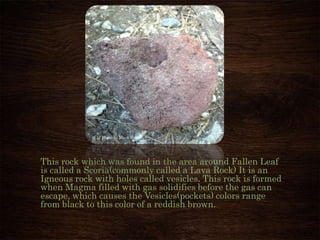 Mark Herron completed a field assignment around South Lake Tahoe, California, where he photographed and researched various rocks, plants, animals, and geological features. Some of his key findings included identifying obsidian and slate rocks, photographing local wildlife like quail and marmots, and documenting the formation and features of lakes in the area like Lake Tahoe and Fallen Leaf Lake. He also discussed restoring a meadow ecosystem through a forest service project. The document included over 20 photos and captions taken by Herron to illustrate the natural features of the area.