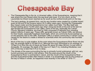 The Chesapeake Bay was formed when rising sea levels flooded the Susquehanna River valley around 10,000 years ago. Parts of the bay contain cliffs composed of deposits from receding waters millions of years ago that are famous for fossilized shark teeth. The bay is generally shallow with an average depth of 21 feet, including tributaries, and over 24% is less than 6 feet deep.
