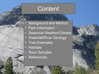 This document summarizes a field report about a hike on the Mist Trail in Yosemite National Park. It describes the location and climate of the park, details of the Mist Trail including landmarks along the way, examples of the types of trees and rocks seen, and some wildlife that inhabits the park's various habitats. References used in compiling the report are also cited.