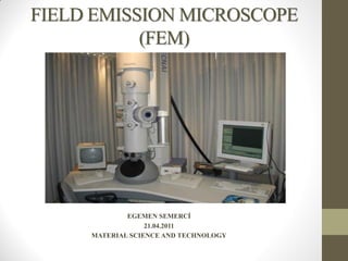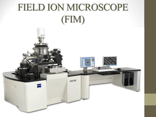 Field emission microscopy (FEM) and field ion microscopy (FIM) are essential analytical techniques in materials science used to analyze molecular surface structures and electronic properties. Both methods developed significant insights through the pioneering work of Erwin Wilhelm Mueller, with FEM providing near-atomic resolution and FIM enabling the observation of individual atoms. The document details their history, instrumentation, working conditions, and applications, highlighting their important roles in studying surface dynamics and characteristics.