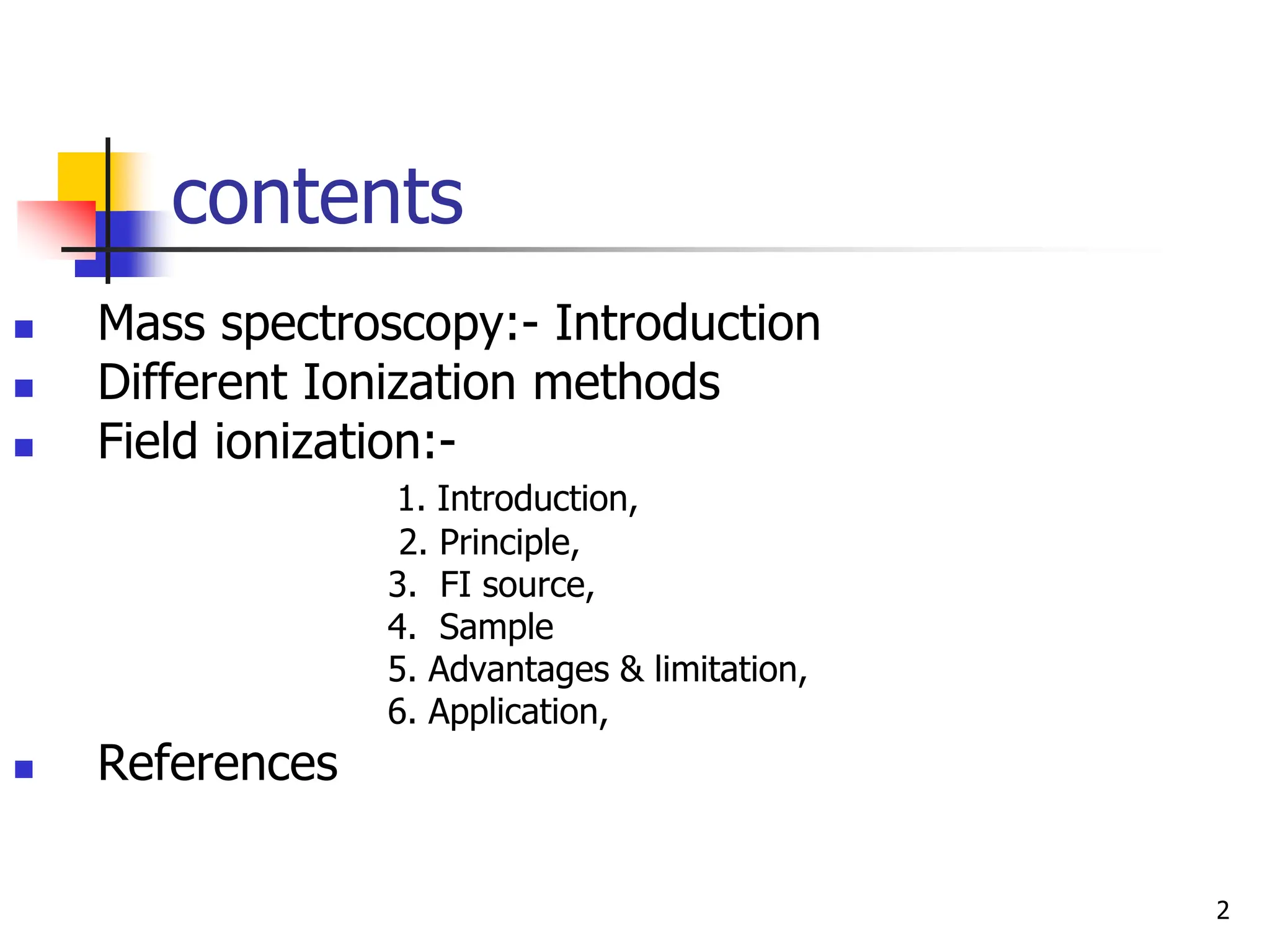 This document discusses field ionization (FI) as an ionization method in mass spectroscopy. FI allows for the ionization of thermally labile and high molecular weight samples. It works by subjecting the sample, in vapor phase, to an intense electric field near a sharp metal tip, causing ionization through quantum tunneling. FI produces predominantly molecular ions with little fragmentation, making it useful for analyzing compounds that are difficult to analyze via electron impact ionization. However, FI has lower sensitivity and resolution compared to other methods. Its applications include analysis in biotechnology, pharmaceuticals, clinical settings, and environmental and geological analyses.