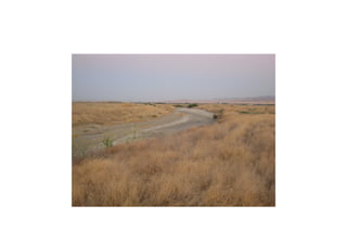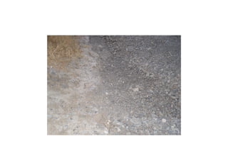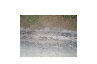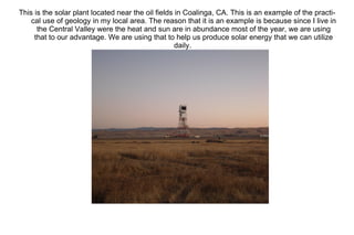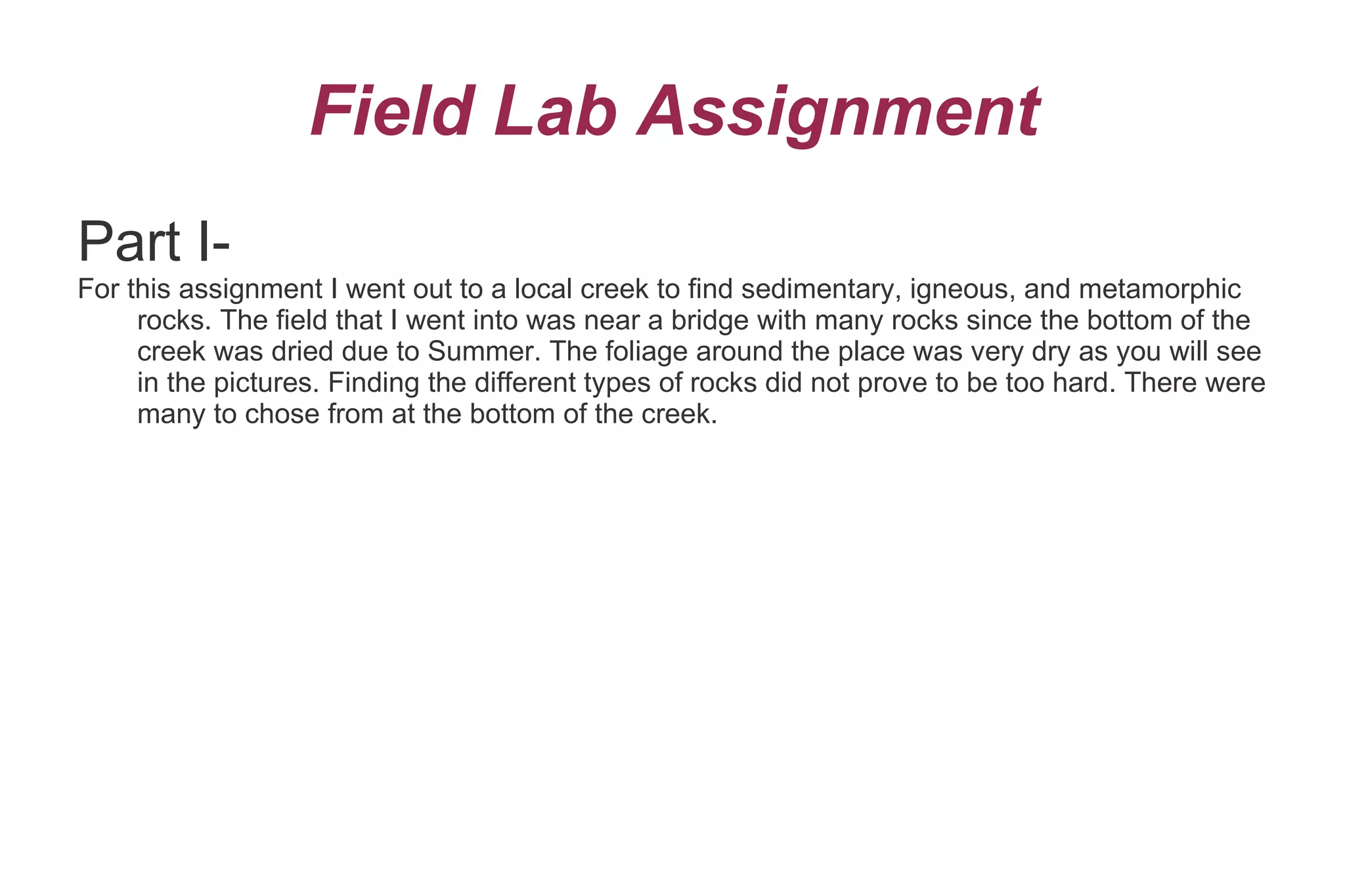 The student went to a local creek near a bridge to find sedimentary, igneous, and metamorphic rocks for a field lab assignment. The creek bed was dry due to summer, making the various rock types easy to find and collect. Photos document the dry creek bed filled with different rock types and the surrounding dry foliage, as well as examples of weathering processes and a nearby solar energy plant.