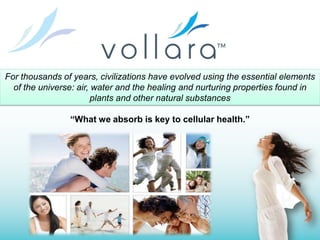 This document discusses Vollara, a company that provides health and wellness products including LivingWater, FreshAir, and nutraceuticals. It summarizes Vollara's history and leadership, commitment to values like compassion and stewardship, and vision of achieving complete physical and financial health through its products and business opportunity. The opportunity allows individuals to share Vollara's technologies and improve others' health while also earning income through retail profits and compensation from building a business by sharing the products and opportunity through quality invitations and follow up.