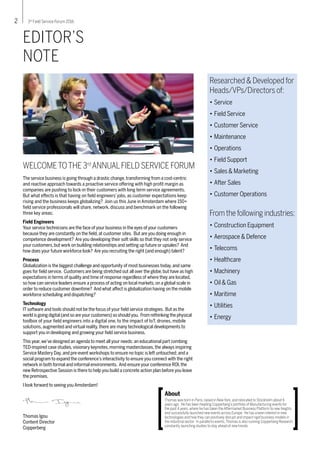 The 3rd Annual Field Service Forum will take place from June 8-9, 2016, in Amsterdam, focusing on the transition of the service business from reactive to proactive models, emphasizing the importance of field engineers and customer satisfaction. The event will feature educational sessions, workshops, and networking opportunities for over 150 field service professionals, addressing topics such as competence development, process globalization, and the impact of technology on field service operations. Attendees will engage in discussions about change management, service innovation, and strategies to enhance service delivery in a competitive landscape.