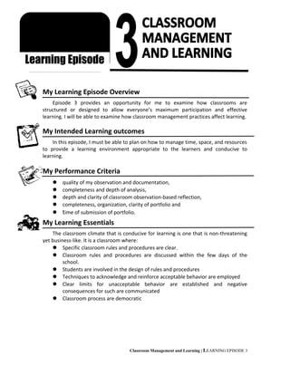 The document discusses a learning episode focused on classroom management. It includes an overview of intended learning outcomes, which are to plan how to manage time, space, and resources to provide an appropriate learning environment. Performance criteria include the quality of observation, analysis, reflection in documentation. Learning essentials discuss establishing clear rules and procedures, involving students in rule design, and reinforcing positive behavior. The student's map outlines steps to observe a class, document components, analyze structure and behavior, and reflect on management's impact. Tools include observation guides. The analysis examines how organization affects behavior and which strategies motivate students. Reflection imagines rules for high schoolers. Theory is integrated by identifying effective behavior management strategies.